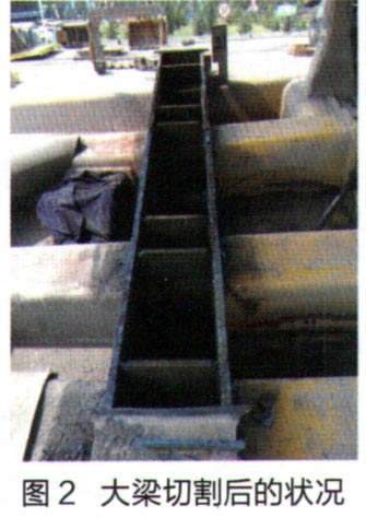 按照以上距離測(cè)量劃線,使用氧乙炔割炬按線切割掉底板,切割后清理熔渣,并修整兩側(cè)立板,使筋板頂端到側(cè)板頂端的距離符合要求,兩側(cè)立板高度一致。大梁切割后的情況如圖2所示。