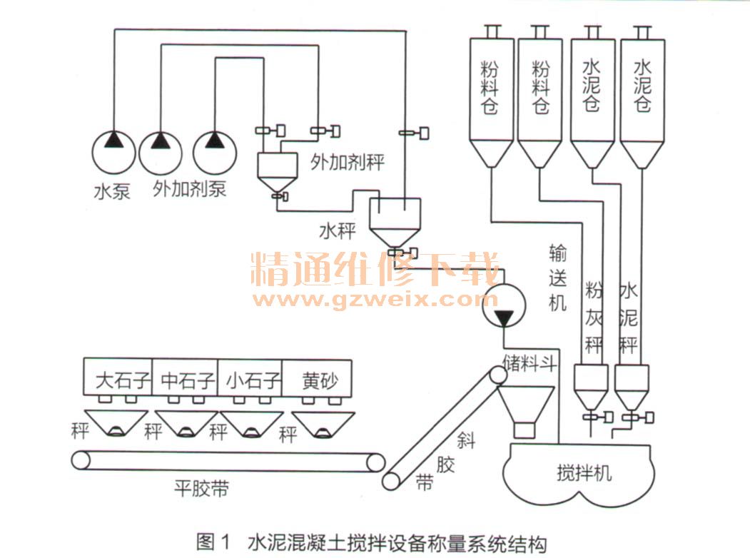 水泥、粉煤灰裝在水泥倉、粉料倉內(nèi),通過螺旋輸料機(jī)將水泥、粉煤灰輸入水泥秤和粉灰秤,經(jīng)過稱量后等待控制系統(tǒng)發(fā)布指令。