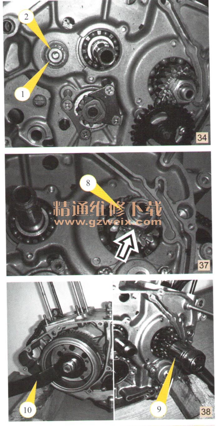 c)按對角線拆卸氣缸頭螺母M8,如圖18所示。拆卸氣缸頭襯墊①、凸輪鏈條導板②和螺母M6,拆卸氣缸,如圖19所示,如果氣缸不能拆卸,可利用塑料錘輕輕敲打無散熱片部分,以使加襯墊的連接松動。將1塊干凈的棉布放在氣缸座上,以防止活塞銷卡簧③掉落在曲軸箱內(nèi),使用長尖嘴鉗拆卸活塞銷卡簧,如圖20所示。使用活塞銷拉出器④拆卸活塞,如圖21所示。拆卸磁電機蓋,如圖22所示。拆卸起動惰輪⑤、襯套⑥和軸⑦,如圖23所示。拆卸起動電機,如圖24所示。