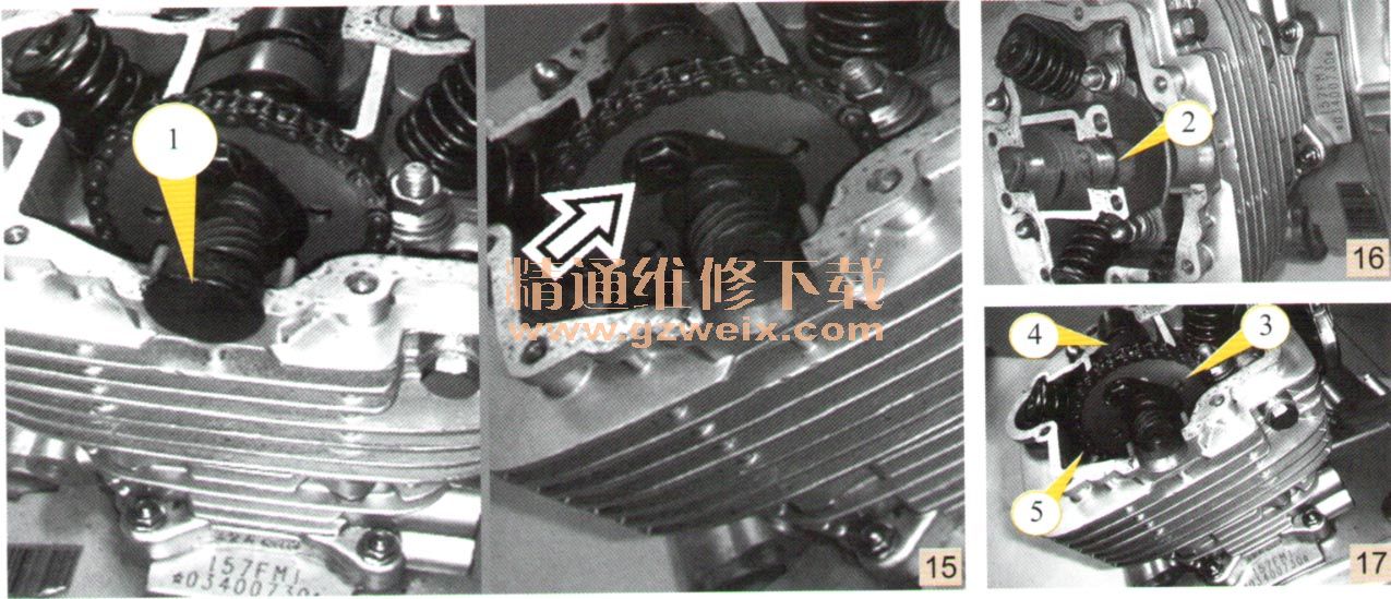 b)拆卸凸輪軸端螺栓①,整平壓板鎖緊片,拆卸凸輪軸鏈輪螺栓,如圖15所示。拆卸C型環(huán)②,如圖16所示。不要使C形環(huán)落入曲軸箱中。拆卸凸輪軸鏈輪③和凸輪軸④,不要使鏈條⑤落入曲軸箱中,如圖17所示。