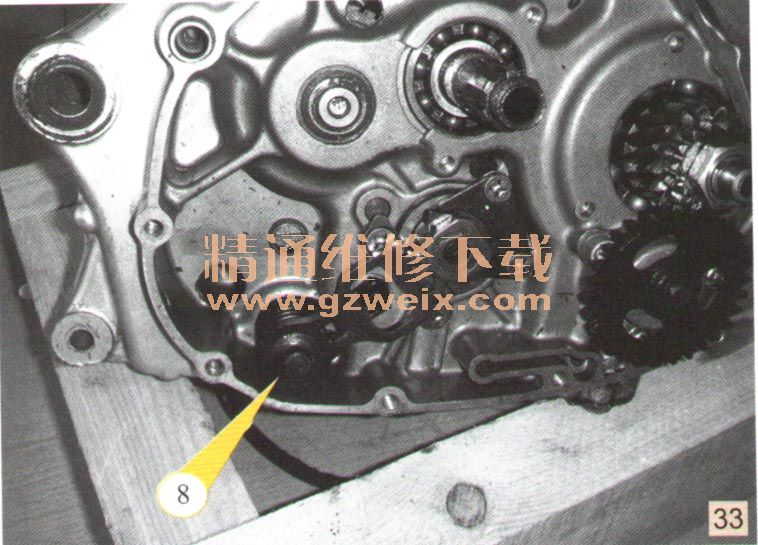 d)拆卸離合器蓋①,如圖25所示。夾緊磁電機轉(zhuǎn)子固定螺栓,按對角線拆卸離合器彈簧盤裝配螺栓,而后拆卸離合器彈簧和離合器彈簧盤,如圖26所示。拆卸離合器主動摩擦片和從動片,如圖27所示。拆卸頂桿②、墊圈③、軸承④和推桿⑤,整平離合器花鍵套熔絲墊圈,如圖28所示。拆卸離合器花鍵套螺母①,使用離合器套夾②拆卸離合器花鍵套③,如圖29、圖30所示。拆卸推力墊圈④和離合器大毅組合⑤,如圖31所示。拆卸推力墊圈⑥和襯套⑦,如圖32所示。拆卸變擋軸⑧,如圖33所示。