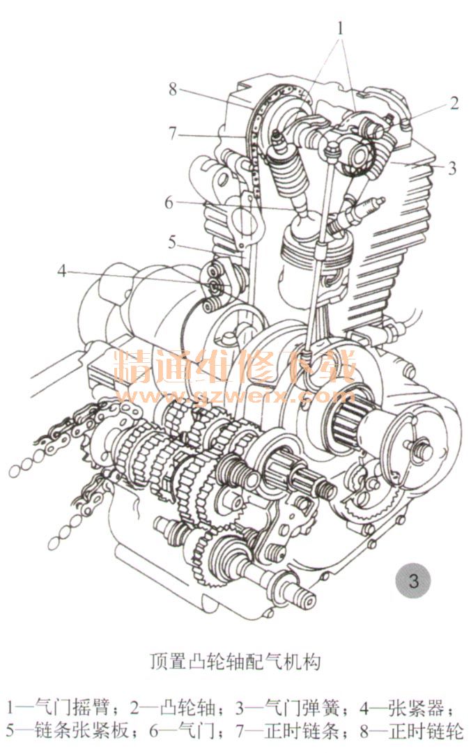 由于頂置凸輪軸式配氣機構(gòu)省去了推桿那樣的往復(fù)運動件,使配氣機構(gòu)傳動組件的慣性力減小,傳動更加靈活,功率響應(yīng)迅速,同時,凸輪直接與搖臂或氣門接觸,故提高了剛性。這些均有利于消除發(fā)動機高速運轉(zhuǎn)時造成的配氣時間差異,使氣門能夠穩(wěn)定開閉,更加有利于高速化。目前絕大多數(shù)現(xiàn)代單缸摩托車發(fā)動機均采用單頂置凸輪軸式配氣機構(gòu)如:WY125、豪邁125、嘉陵JH 125等。也有部分雙缸發(fā)動機,采用單頂置凸輪軸式配氣機構(gòu)。如:本田CH125水冷摩托車(如圖4所示)、本田CB 125T、嘉陵本田CB125T、新大洲本田CB 125T、 CL 125-2/3以及國產(chǎn)CB 125T摩托車等。而部分進(jìn)口四沖程摩托車,如木田MAGANA250、本田VT250F、 CBX250、鈴木GSX400F、川崎GPZ250、雅馬哈XS750以及春蘭250虎神摩托車等,則采用雙頂置凸輪軸(DOHC)配氣機構(gòu)。