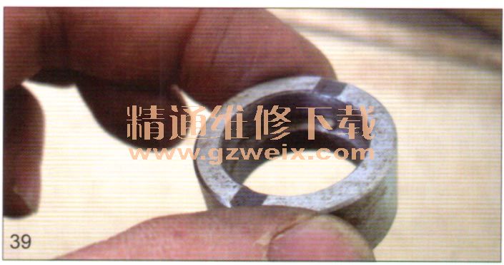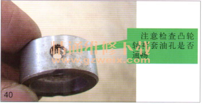 檢查襯套:在檢查凸輪軸兩端的襯套時(shí),可持?jǐn)?shù)顯游標(biāo)卡尺測(cè)量襯套的單邊內(nèi)外圓周邊尺寸(不少于6個(gè)測(cè)量點(diǎn)),用襯套單邊厚度的最大值減去最小值數(shù)值的二分之一,即是該襯套的同心度值,應(yīng)不大于0.02 mm。同時(shí)注意檢查襯套上的潤(rùn)滑油孔是否通暢如圖39, 40所示。