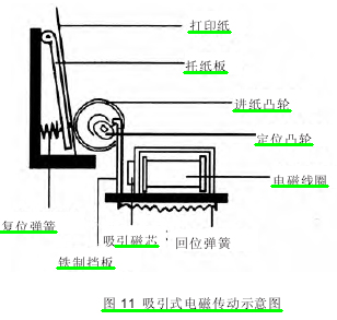 來控制走紙的傳動(dòng)方式。吸引式電磁離合器的基本結(jié)構(gòu)如圖 11 所示。它由進(jìn)紙凸輪、定位凸輪、托紙板、吸引磁芯、電磁線圈、復(fù)位彈簧和回位彈簧等部件構(gòu)成。正常情況下,進(jìn)紙凸輪被一鐵制擋板限制,當(dāng)發(fā)出走紙信號(hào)后,電磁線圈流過電流,由于電磁感應(yīng),線圈所產(chǎn)生的感應(yīng)磁場(chǎng)吸引鐵制擋板,進(jìn)紙凸輪即被釋放,帶動(dòng)進(jìn)紙凸輪旋轉(zhuǎn),即將一張打印紙送入打印軌道。然后,電磁線圈電流消失,鐵制擋板失去吸引力,在回位彈簧的作用下恢復(fù)原先狀態(tài),擋住凸輪轉(zhuǎn)動(dòng),這樣即完成了一個(gè)走紙過程。