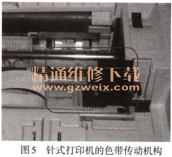 3)色帶傳動(dòng)機(jī)構(gòu)。色帶傳動(dòng)機(jī)構(gòu)是驅(qū)動(dòng)環(huán)形色帶做單向步進(jìn)循環(huán)移動(dòng)的機(jī)構(gòu)。色帶常用涂有黑色或藍(lán)色油墨的帶狀尼龍或薄膜制成,它的作用同復(fù)寫紙一樣,當(dāng)打印針撞擊色帶時(shí),通過色帶的復(fù)印作用,在紙上印出字符或圖形。
