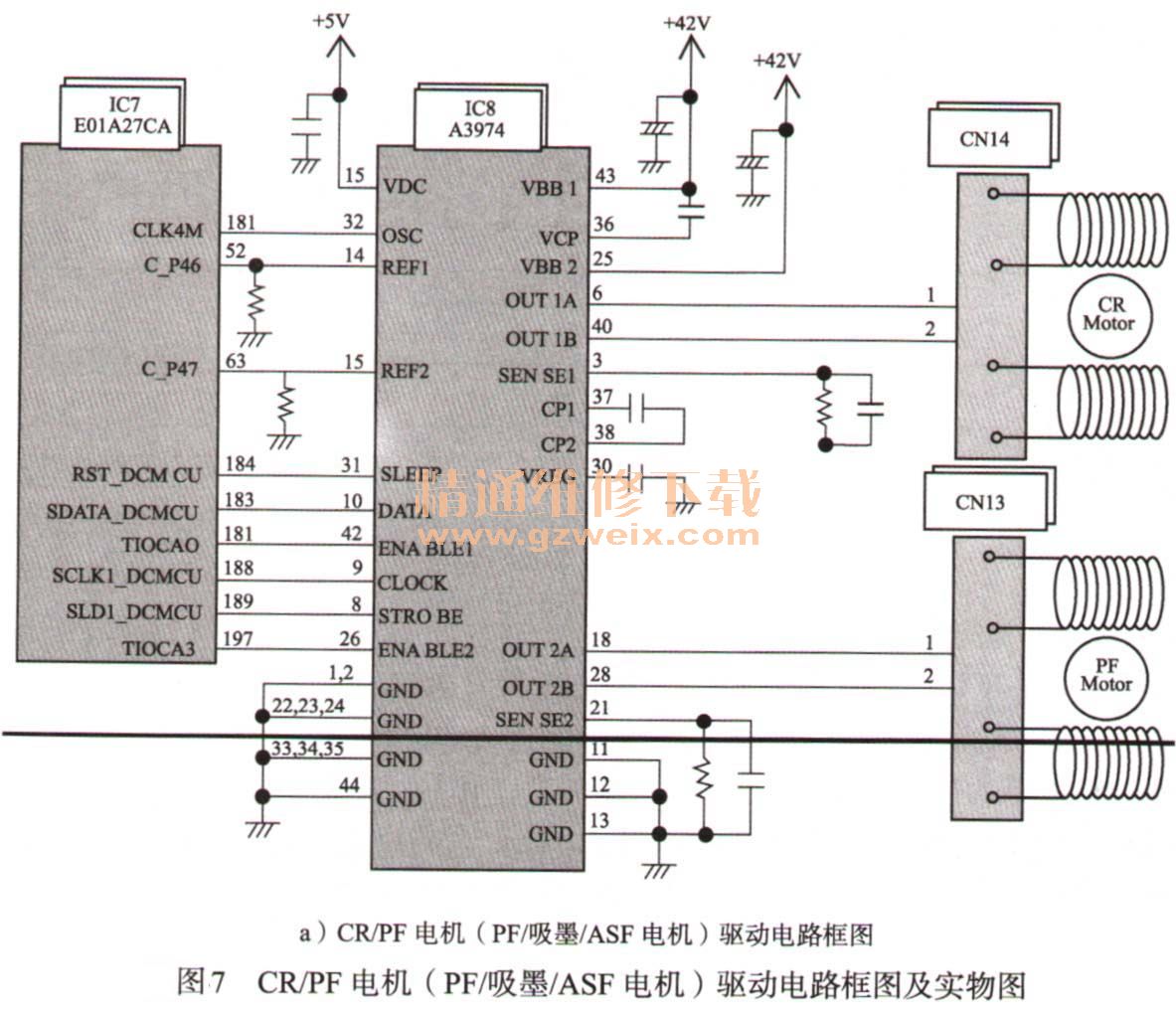 主板上的電機(jī)驅(qū)動芯片(IC8)驅(qū)動CR/PF電機(jī),使用直流電機(jī)并采用PWM(恒流脈寬調(diào)制)進(jìn)行驅(qū)動。如圖7所示為CR/PF電路(PF/吸墨//ASF電機(jī))驅(qū)動電路框圖及實物圖。