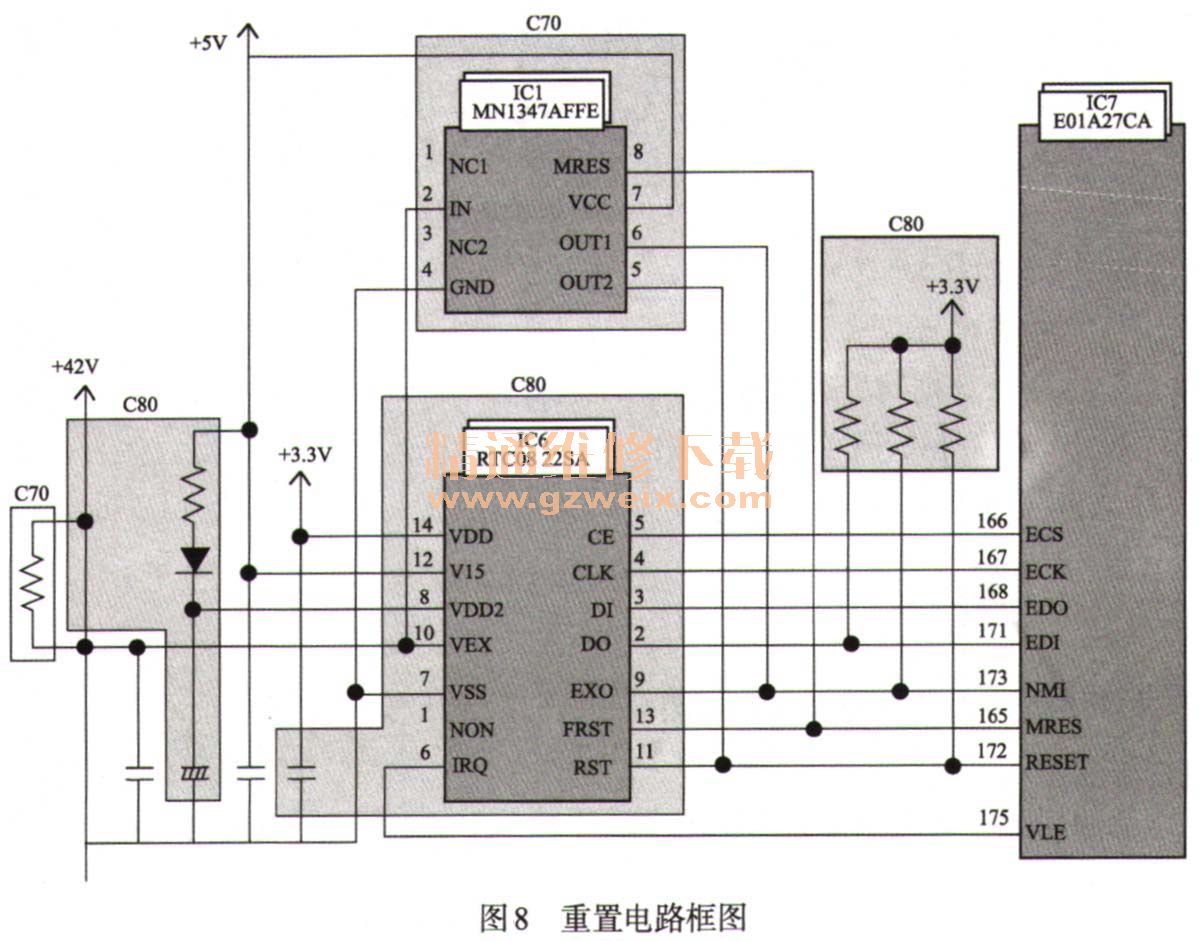 重置電路由重置集成電路組成。重置電路安裝在主板上,用以監(jiān)控兩種電壓:+5V的邏輯線路和+42V驅(qū)動線路。當(dāng)各電路在相應(yīng)的線路上檢測到異常時,電路將輸出一個重置信號以重置CPU(IC7)。這一功能對于防止打印機(jī)的異常操作非常重要。此集成電路可同時監(jiān)控+5V和+42V線路,并能分別重置這些線路。重置電路在+5V線路變?yōu)榈扔诨虻?.2V或+42V線路變?yōu)榈扔诨虻陀?3.2V時可輸出重置信號。如圖8所示為重置電路框圖。