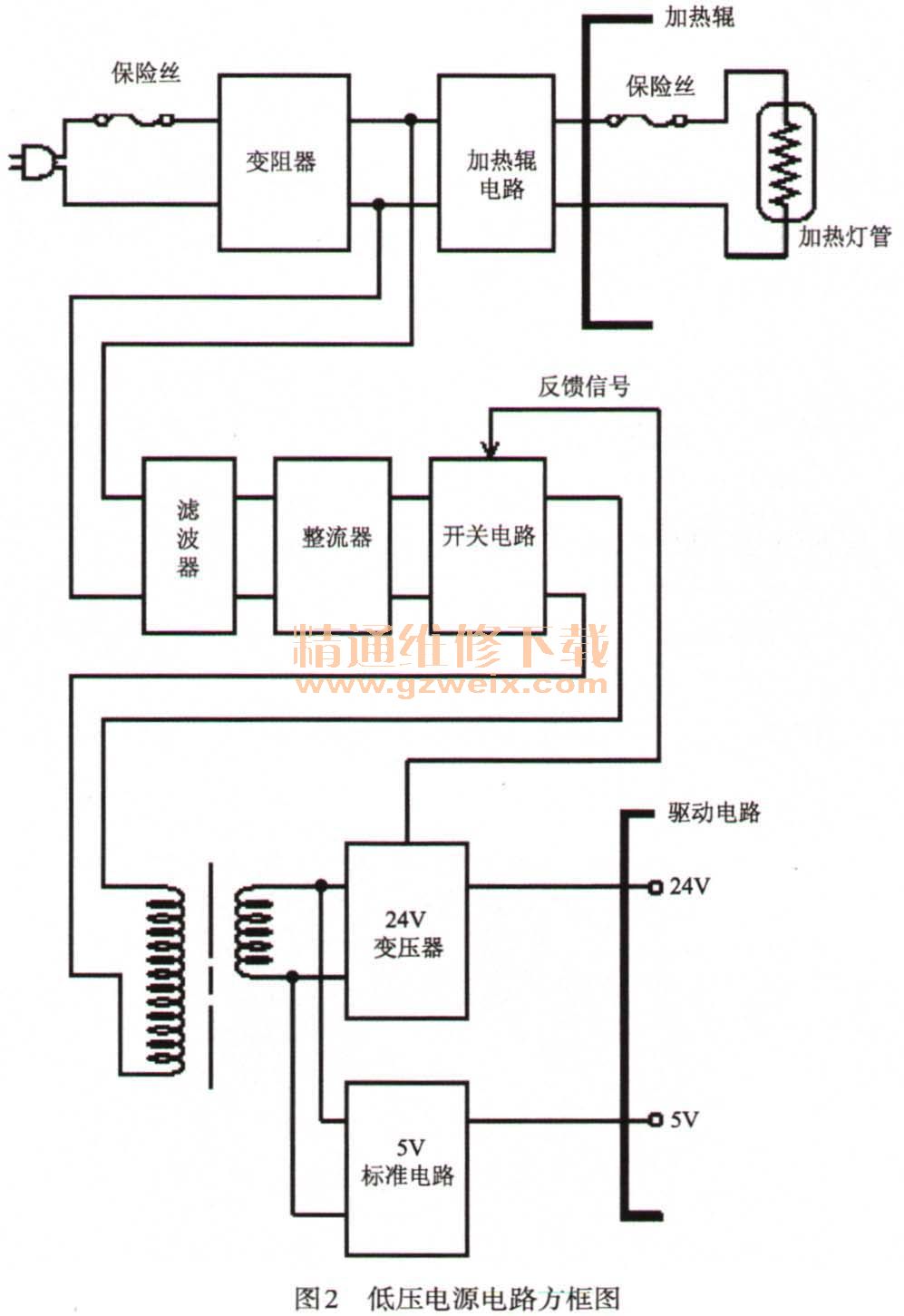 低壓電源主要由加熱電路(為加熱燈供電)、濾波電路、整流電路、主開關電路、開關變壓器、整流濾波電路、保護電路等組成。如圖2所示為激光打印機低壓電源電路方框圖。