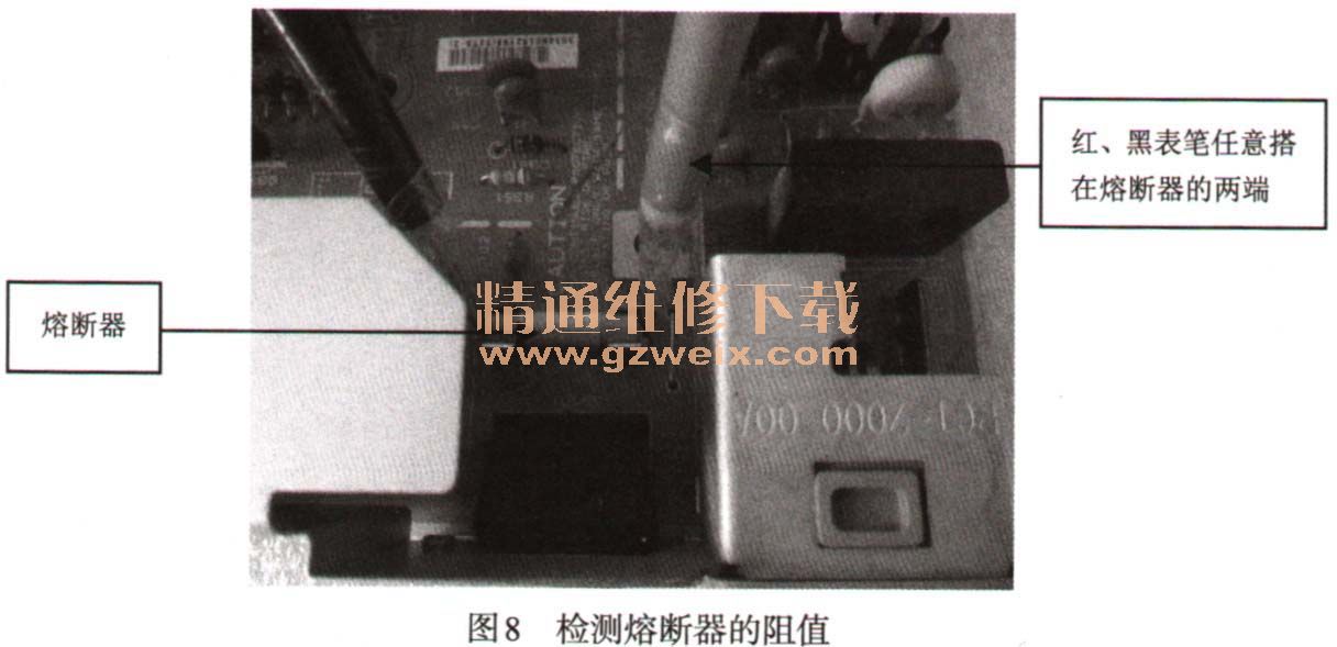 步驟02 檢測電源電路的熔斷器是否良好。具體的檢查方法是:用萬用表檢測熔斷器的阻值,如圖8所示。如果測得的電阻值很小或?yàn)榱悖瑒t說明熔斷器良好;若測得的電阻值為無窮大,則說明熔斷器已經(jīng)損壞,需要更換熔斷器。