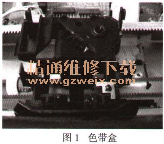步驟02 如果還是經(jīng)常出現(xiàn)故障,一般都是字車上色帶驅(qū)動(dòng)齒輪的軸磨損偏心所致,因?yàn)樽周嚿系牧慵际撬芰霞_@種故障在使用較久的打印機(jī)上常見。此時(shí),取下色帶盒,如圖1所示,剪一片銅薄或銘薄包在齒輪的軸上,以減小軸向間隙。