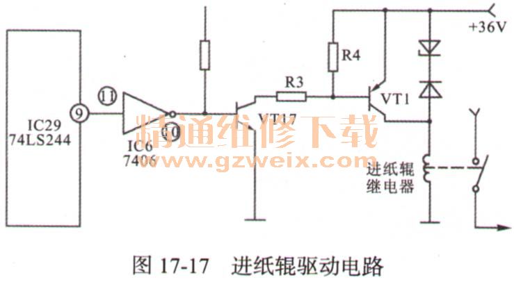 檢查進(jìn)紙輥驅(qū)動(dòng)繼電器,相關(guān)電路如圖17-17所示。感覺(jué)其吸合阻力較大,用萬(wàn)用表測(cè)量,發(fā)現(xiàn)繼電器線圈兩端電壓偏低。