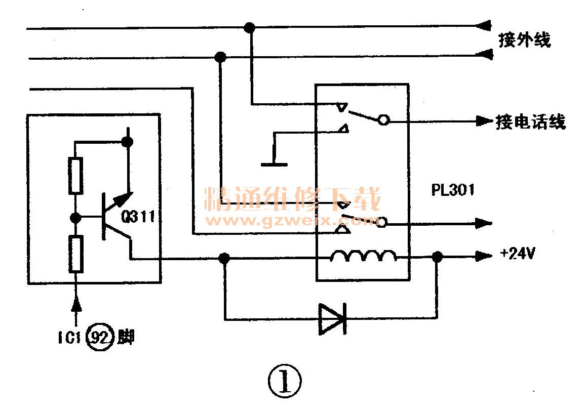 分析檢修:根據(jù)現(xiàn)象分析,該故障可能出在傳真/電話轉(zhuǎn)換控制電路等相關(guān)部位。有關(guān)電路如圖1所示。