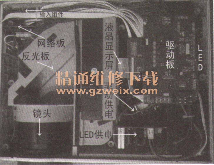 拆下底部螺絲,看到機(jī)內(nèi)有兩塊電源板、一塊驅(qū)動(dòng)組合板、信號板、WIFI網(wǎng)絡(luò)板、LED燈泡及鏡頭套件,如圖1所示。